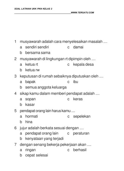 Soal ukk pkn kelas 2 sd terbaru untuk ukk 2016 (15 pg, 10 isian, 5 esay) Contoh soal latihan ulangan kenaikan kelas (ukk) mata pelajaran pkn kelas 2 sd terbaru terdiri dari 20 soal pilihan ganda, 10 soal isian, . Pada contoh soal yang kami bagikan ini merupakan soal untuk ulangan tengah semester atau penilaian tengah semester untuk kelas 2 sd. Download soal pat/ukk pkn kelas 2 sd/mi pilihan ganda + essay dan kunci jawaban semester 2 (genap) kurikulum 2013 (k13) tahun ajaran . Pembahasan soal latihan pkn kelas 2 sd mi semester 2 dilengkapi kunci jawaban terbaru sebagai bahan persiapan menghadapi ujian.